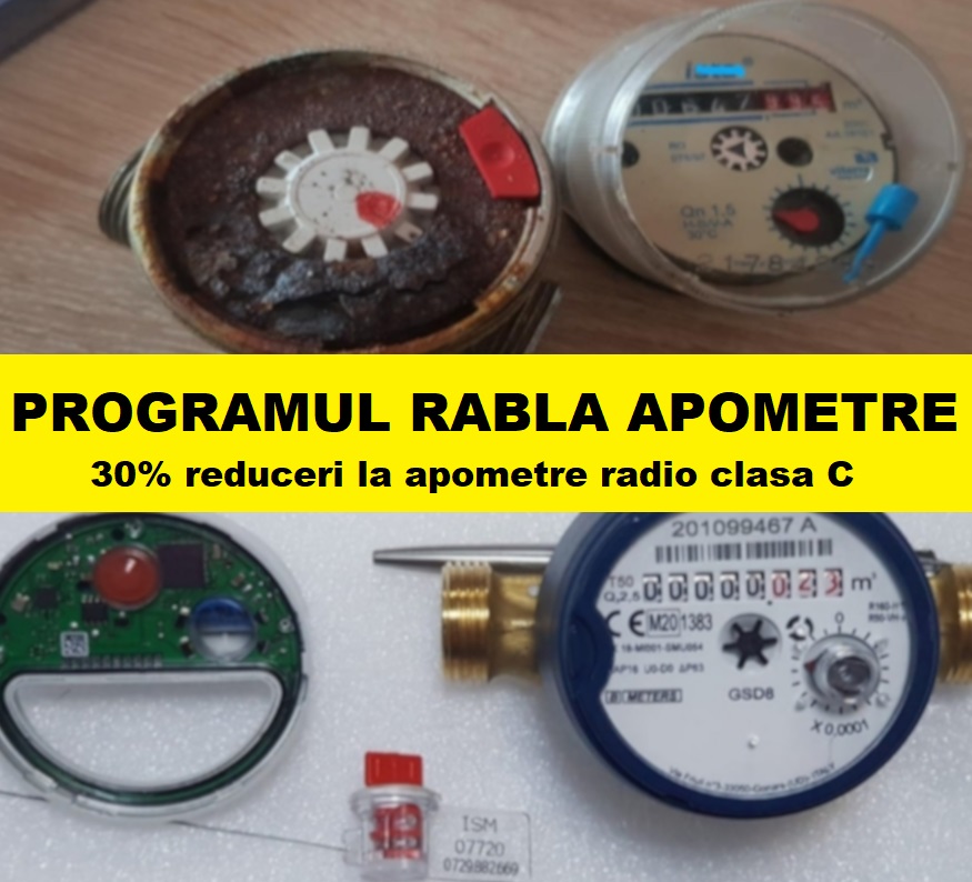 Pentru ca ne pasa si pentru ca dorim sa sprijinim cu toate fortele modernizarea contorizarii apei am hotarat sa lansam pentru Dumneavoastra “Programul rabla pentru apometre”. Astfel toti proprietarii apartamentelor care inlocuiesc contoarele de apa vechi cu cele inteligente, clasa metrologica C cu citire radio de la distanta pana la 31 August 2021 si la finalul lucrarilor de inlocuire predau apometrele vechi echipelor noastre beneficiaza de o reducere de pana la 30% la pretul unui apometru radio din apartament!